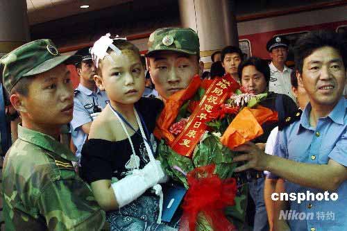 五月二十五日,一名來(lái)自四川廣元的小傷員被兩軍解放軍戰(zhàn)士抱起。當(dāng)日上午十一時(shí)零三分,滿載著二百七十二名汶川大地震受傷人員的廣元至鄭州“運(yùn)送災(zāi)區(qū)受傷親人”專(zhuān)列抵達(dá)鄭州火車(chē)站,他們將在當(dāng)?shù)鼐偶抑付ㄡt(yī)院接受治療。中新社發(fā) 李志全 攝