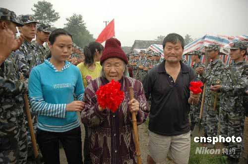 圖:四川震區(qū)89歲老奶奶向解放軍獻花