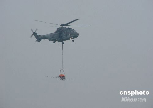 5月25日下午,香港特區(qū)政府飛行服務隊的“超級美洲豹”開始對外掛噴灑系統(tǒng)進行安裝并試車。外掛噴灑系統(tǒng)是一個米黃色球體,內(nèi)裝900公升液體,懸掛在飛機下部200米處,工作人員在空中通過操作盤控制外掛噴酒系統(tǒng)指令開起閥門,將液態(tài)藥物灑下!俺壝乐薇边m用山地飛行,在地形復雜、山勢險惡的四川地震災區(qū)將發(fā)揮其重大作用。中新社發(fā) 張鈺昱 攝