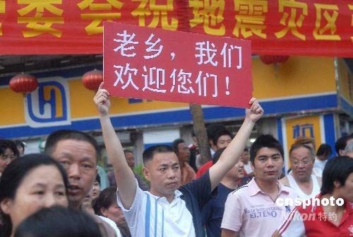 圖為一位市民打出“老鄉(xiāng),我們歡迎您們”的橫幅,歡迎從地震災區(qū)來的傷員。