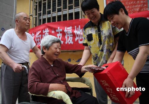5月27日,退休老人張世俊(左一)推著老伴來到捐款站,把節(jié)儉下來的5000元錢投進(jìn)捐款箱。這是老夫妻倆第三次為地震災(zāi)區(qū)捐款獻(xiàn)愛心。汶川大地震發(fā)生后,張世俊、李愛玲夫婦先后三次把省吃儉用的2萬(wàn)元錢捐給地震災(zāi)區(qū),在當(dāng)?shù)乇粋鳛榧言。中新社發(fā) 吉 喆 攝
