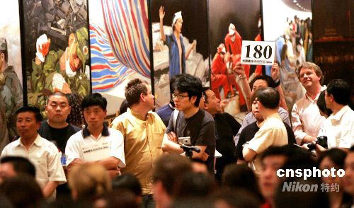 5月28日凌晨,“共同渡過·中國當(dāng)代藝術(shù)界賑災(zāi)義拍”在北京圓滿落幕,值得一提的是,由29名寫實畫派藝術(shù)家集體創(chuàng)作的以抗震救災(zāi)為主題的油畫作品參與了拍賣,并在43輪競價后拍出了3350萬元的天價。這場拍賣持續(xù)4個小時,全場總成交額一舉突破5100萬元人民幣,全部拍賣所得將通過中華慈善總會捐獻(xiàn)四川地震災(zāi)區(qū)。中新社發(fā) 楊可佳 攝