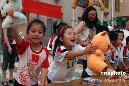 5月28日上午,河南油田五一社區(qū)黃山幼兒園開展“油城飄起黃絲帶,師幼愛心獻災(zāi)區(qū)”義賣捐款活動。200多名小朋友把自己平時喜愛的玩具、課外書等拿出來義賣,在園內(nèi)擺起一個個“愛心”小攤。幼兒園將義賣款項做為孩子們“六一”兒童節(jié)的愛心禮物,捐獻給四川災(zāi)區(qū)的小朋友。中新社發(fā) 李永哲 攝
