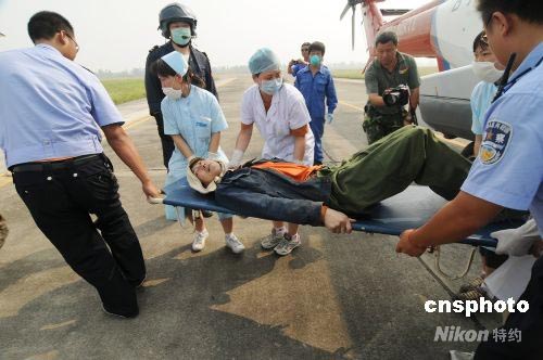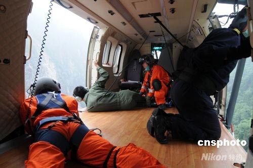干溝電站地勢(shì)險(xiǎn)峻,四周高山環(huán)繞,由于塌方嚴(yán)重,亂石堆砌,惡劣的環(huán)境給救助直升機(jī)實(shí)施救助帶來(lái)極大的困難。直升機(jī)離最近的懸崖不到5米。機(jī)長(zhǎng)李嘉只能將直升機(jī)從200米高空緩緩地一點(diǎn)點(diǎn)往下降,最后穩(wěn)穩(wěn)地懸停在30米高空。B-7125救助直升機(jī)立即進(jìn)入救助模式,絞車手迅速拉開(kāi)機(jī)艙,救生員緊握著鋼纜,躍出艙門,從30米的空中降下。此時(shí),被困16天的4名被困人員從山溝里爬到救援點(diǎn),救生員李春林迅速用救援套將一位傷員套好,然后頂著直升機(jī)旋翼產(chǎn)生的大風(fēng),抓緊鋼纜,又空中搖晃了十幾圈,終于把第一位傷員救上直升機(jī)。緊接著,另一位救生員楊建輝也降落在地面上,他用救援套將兩名傷員一起救上直升機(jī)。隨后,楊建輝再次躍出機(jī)艙,迅速來(lái)到重傷員尚征林身邊。楊建輝用盡全身力氣把他套好,然后緊抱著他,抓緊鋼纜,一起被拉上直升機(jī)。經(jīng)過(guò)10多分鐘的緊急救援,4名傷員都成功救上直升機(jī)。