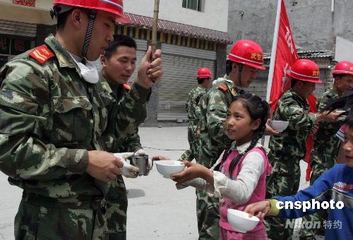 武警交通直屬工程部經(jīng)過6天奮戰(zhàn),5月27日終于打通了臥龍至“孤島”耿達(dá)的“生命線”,各種給養(yǎng)補(bǔ)給車輛開進(jìn)被與世隔絕的重災(zāi)區(qū)耿達(dá)鎮(zhèn),當(dāng)?shù)孛癖姼兄x武警官兵。中新社發(fā) 江胡 劉亞軍 攝
