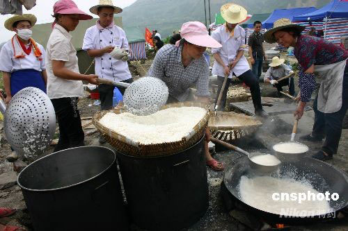 5月24日以來,來自北京全聚德、便宜坊、三只耳、眉州東坡酒樓等飯店的30名廚師,在重災(zāi)區(qū)之一的四川彭州市小魚洞鎮(zhèn),為當(dāng)?shù)卮迕窈歪t(yī)療人員提供免費(fèi)的“賑災(zāi)飯”。當(dāng)?shù)卮迕窦娂娗皝韼兔,同煮一鍋“賑災(zāi)飯”。中新社發(fā) 楊杰 攝