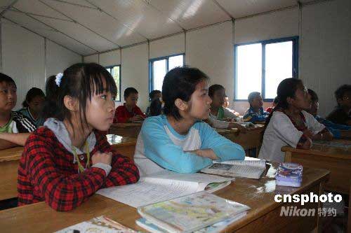 5月29日,文縣碧口小學(xué)學(xué)生在剛剛建成的抗震希望小學(xué)活動板房里上課,這是甘肅省重災(zāi)區(qū)隴南在廢墟上建成的第一所災(zāi)區(qū)希望小學(xué)。由共青團甘肅省委和甘肅省青少年基金會募集資金100多萬元建成的學(xué)校,共搭建活動板房教室22間1320平方米,可容納全校1200多名學(xué)生上課。中新社發(fā) 劉二銀 攝
