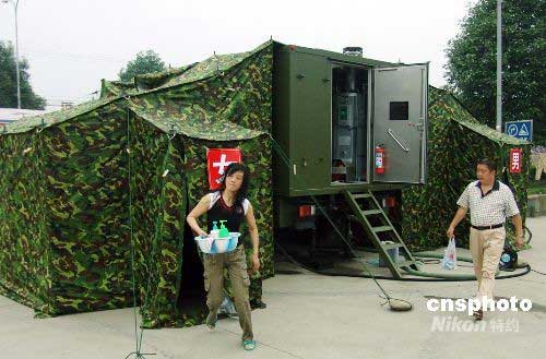 圖:濟南軍區(qū)野戰(zhàn)淋浴車開進都江堰災區(qū)