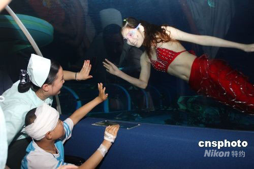 5月29日,重慶海底世界迎來了一批特殊的客人——來自四川地震災(zāi)區(qū)的6名小朋友。在武警重慶總隊醫(yī)院醫(yī)護人員陪同下,6名災(zāi)區(qū)小傷員參觀游覽了重慶海底世界,以這種特殊方式慶祝“六一”兒童節(jié)的到來。中新社發(fā) 賴熙平 攝
