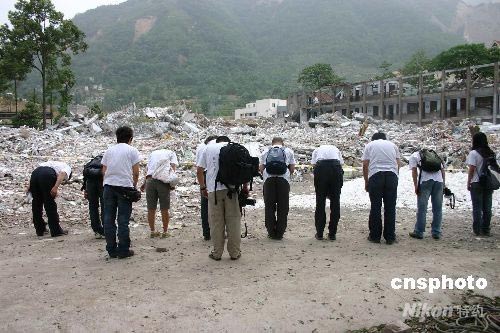 《中國新聞周刊》編輯記者在北川中學(xué)廢墟前默哀