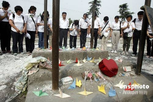 志愿者“六一”在都江堰向遇難孩子默哀
