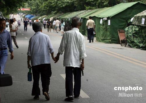 六月一日,唐家山堰塞湖避險疏散預(yù)案三分之一潰壩方案涉及的下游群眾,已全部撤離到安全地帶。 一對年過古稀的老人牽手在綿陽市游仙區(qū)綿山路上新建的疏散安置點悠閑散步。中新社發(fā) 王瑤 攝