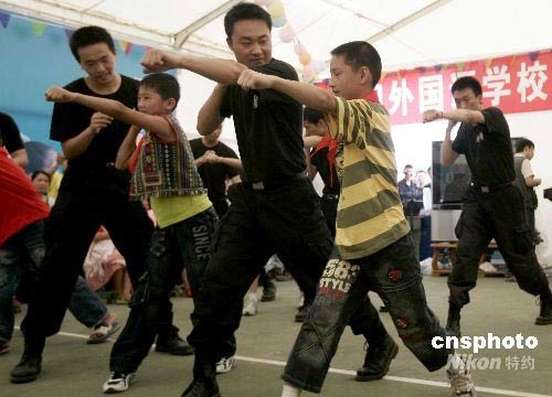 地震災(zāi)區(qū)的兒童節(jié):男孩向特警學(xué)習(xí)軍體拳