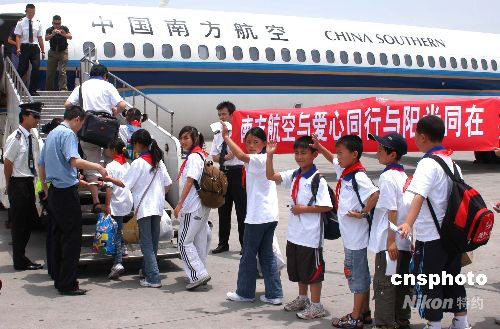 6月2日中午,成都雙流國際機(jī)場,89名來自北川、彭州、寶興、崇州等地震災(zāi)區(qū)失去親人的兒童,乘坐南方航空海南分公司的愛心專機(jī)前往海南三亞,進(jìn)行為期半個(gè)月的“愛心呵護(hù)、陽光行動(dòng)”心靈呵護(hù)之旅。他們中年齡最大的16歲,最小的8歲。中新社發(fā) 尹海明 攝