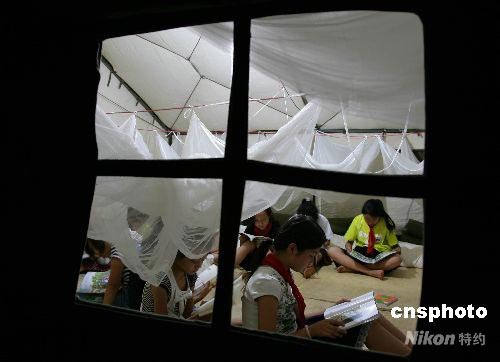 圖:地震災(zāi)區(qū)的孩子在帳篷學(xué)校刻苦夜讀
