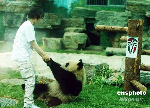 圖為在活動場里憨態(tài)可掬的大熊貓與飼養(yǎng)員“拔河”。6月5日上午,8只四川大熊貓首次與游客在北京動物園見面。他們憨態(tài)可掬十分惹人喜愛,頑皮的動作不時引得游客發(fā)出笑聲。這8只分別叫做翠翠、朵朵、美欣、鳳儀、淘淘、朗朗、歡歡、福娃的活波可愛的大熊貓分別住在面積為20多平方米的3間獸舍內(nèi),每間獸舍都安裝了空調(diào),室內(nèi)的溫度控制在大熊貓喜歡的25攝氏度左右,這使這些可愛的大熊貓感受到與四川臥龍家鄉(xiāng)一樣的環(huán)境。中新社發(fā) 筱瑋 攝