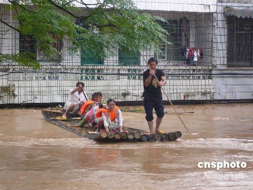6月11日至13日凌晨,永?h普降特大暴雨,降雨量高達(dá)346.3毫米,縣城東河和西河的洪水水勢兇猛,西河水最高達(dá)到143.45米,超過警戒水位5.45米。截止到13日10時(shí)許,永福全縣被洪水圍困民眾4900人,緊急轉(zhuǎn)移安置民眾4600多人。圖為救援人員正奮力轉(zhuǎn)移被洪水圍困的民眾。中新社發(fā) 周利朔 攝