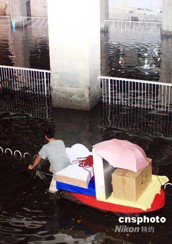 6月13日晚,警察站在水中望著被雨水淹沒的汽車。當(dāng)日傍晚,北京突降雷暴雨,造成部分道路積水。北京知春路地鐵站橋下雨水囤積比較嚴(yán)重,多輛汽車被水淹沒,在警察指揮下行人有序通過馬路。截至發(fā)稿已是夜間十一點,雨水還未排干,公安干警、交警、消防隊等部門仍在雨中忙碌。中新社發(fā) 王昊(北京) 攝