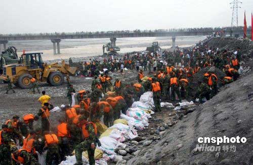 6月13日,在四川綿竹抗震救災(zāi)的空降兵某部600多名官兵經(jīng)過10個多小時的連夜奮戰(zhàn),終于將綿遠(yuǎn)河大堤因上游小崗劍堰塞湖爆破后形成洪峰沖垮的120多米潰口成功封堵。圖為河水迅速上漲,官兵們奮力搶筑大堤潰口。中新社發(fā) 李良泰宋超 攝