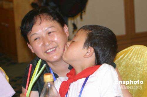 6月15日上午,參加“愛(ài)心呵護(hù)、陽(yáng)光行動(dòng)”活動(dòng)的四川災(zāi)區(qū)孩子,在告別文藝演出現(xiàn)場(chǎng)深吻一直陪伴他們的心理學(xué)專家岳教授,表達(dá)內(nèi)心感恩。中新社發(fā) 付美斌 攝