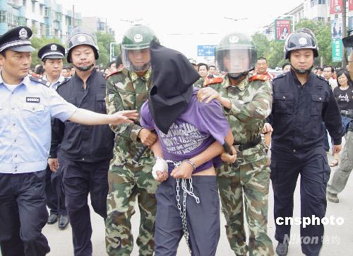 6月21日,犯罪嫌疑人方某被安徽省六安市舒城縣公安局民警押回。6月17日,因為“姐弟戀”遭到女方父母反對,犯罪嫌疑人方某竄入比他大6歲的女友李某家,將其父母等祖孫4人殺害。經(jīng)過近60個小時的偵破和緝拿,6月21日上午10時許,安徽省六安市舒城縣警方從千里之外的浙江江山市將犯罪犯罪嫌疑人方某押回舒城。中新社發(fā) 張發(fā)平 攝