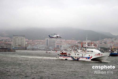 6月23日下午,山東省威海市在威海灣舉行大規(guī)模?樟Ⅲw搜救與船舶污染應(yīng)急演習(xí),檢驗(yàn)威海海域奧運(yùn)期間海上安全監(jiān)管與救助的能力。來(lái)自交通運(yùn)輸部北海救助局、交通運(yùn)輸部北海第一救助飛行隊(duì)、山東海事局海上巡查執(zhí)法支隊(duì)、陸軍和海軍駐威某部的11艘各類船舶、1架救助直升機(jī)參加了演習(xí)。此次演習(xí)重點(diǎn)演練了海上交通管制、海上交通事故人命救助、船舶消防和船舶溢油圍控等。中新社發(fā) 李志強(qiáng) 攝