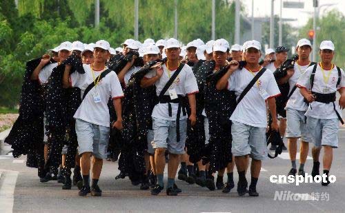 7月20日,北京奧運會開幕式演職人員帶著道具走進(jìn)“鳥巢”。離奧運開幕越來越近,北京國家體育場“鳥巢”里正加緊開幕式的彩排工作。中新社發(fā) 王東明 攝