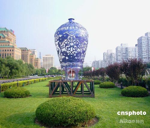 7月20日,一個(gè)高4米左右的“青花瓷”瓶奧運(yùn)花壇在北京長(zhǎng)安街亮相,其清新典雅的“芳姿”成為一道別致風(fēng)景。中新社發(fā) 玉龍 攝