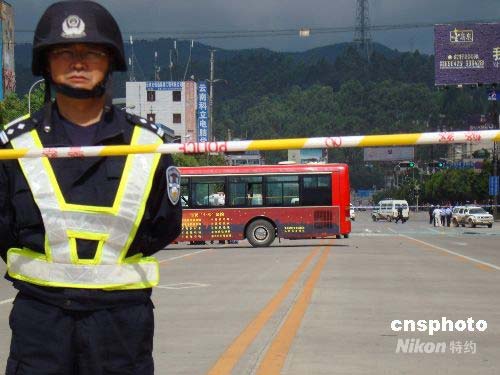 7月21日上午7時10分、8時05分左右,在云南省昆明市人民西路云大醫(yī)院側(cè)門、昌源路與人民西路交叉口分別發(fā)生公共汽車爆炸案。圖為警方在昌源路與人民西路交叉口爆炸現(xiàn)場拉起警戒線,禁止一切行人車輛通過。中新社發(fā) 楊洋 攝