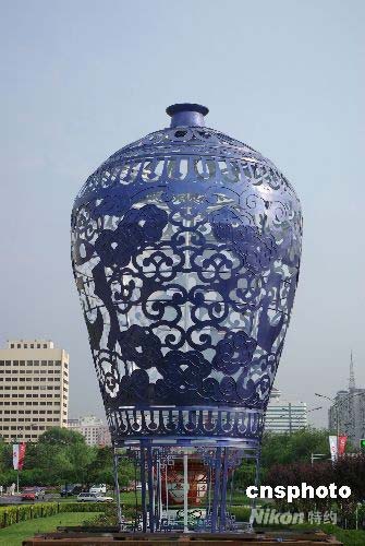 7月21日,一只裝飾清秀素雅的高大“青花瓷”矗立在北京長(zhǎng)安街上,給即將到來(lái)的北京奧運(yùn)會(huì)更添幾分中國(guó)色彩。中新社發(fā) 九州 攝