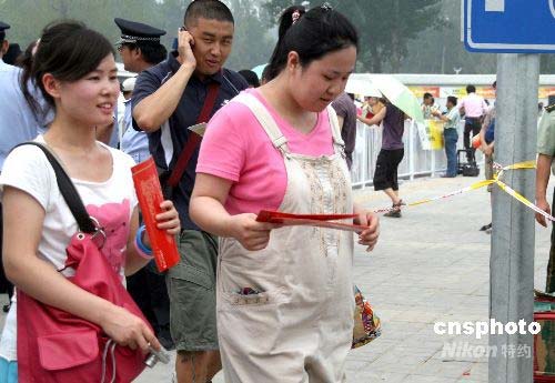 最后一批北京奧運門票于25日正式開始銷售,大批市民前來搶購門票。圖為一位孕婦在家人的陪同下不畏酷暑也來購買奧運門票。中新社發(fā) 葉林 攝