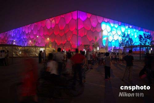 7月25日,隨著北京奧運會的臨近,奧運場館“水立方”五顏六色的彩燈在夜色中交相輝映,變幻萬千,令北京的夜晚愈加迷人。中新社發(fā) 九州 攝