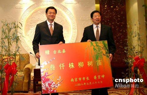 七月二十六日,南京市官員會(huì)見臺(tái)北縣長(zhǎng)周錫瑋一行十人,并向其贈(zèng)送三千棵柳樹、一幅巨型云錦作禮物。臺(tái)北縣南京參訪團(tuán)于二十五日晚間抵達(dá)南京,展開為期五天的訪問。中新社發(fā) 朱曉穎 攝