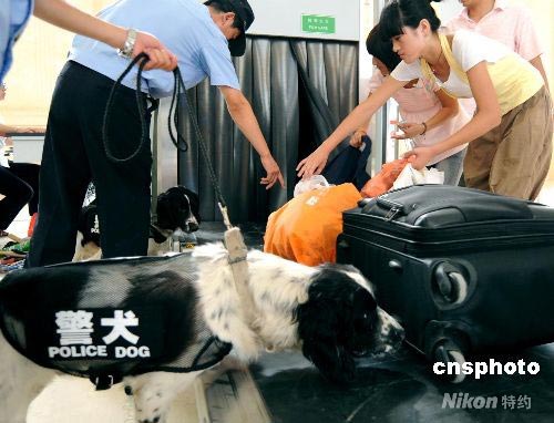 為確保二00八北京奧運會青島奧帆賽的安全,青島火車站鐵路公安處引進德國邢偵犬、比利時緝毒犬、英國搜爆犬等犬種,對客貨物品進行嚴格檢查,在青島火車站廣場上巡邏盤查可疑人員。圖為旅客進站物品通過安檢后搜爆犬再次把關(guān)。 中新社發(fā) 曲連遵 攝
