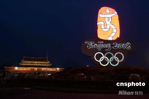 7月28日,天安門廣場迎接奧運(yùn)會(huì)花卉景觀制作工作進(jìn)入最后收尾階段,用鮮花裝點(diǎn)的“中國印”彩燈在晚上點(diǎn)亮,喜迎北京奧運(yùn)會(huì)。 中新社發(fā) 富田 攝