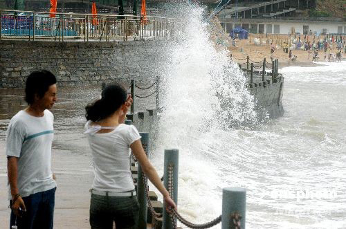 2008年7月30日,江蘇連云港由于受今年第8號(hào)臺(tái)風(fēng)“鳳凰”的外圍影響,海域風(fēng)力大增,沿海風(fēng)力達(dá)到8--9級,洶涌的海浪與岸邊的礁石相撞擊,卷起層層浪花。當(dāng)?shù)貧庀笈_(tái)已發(fā)布防臺(tái)警報(bào)。中新社發(fā) 王春 攝