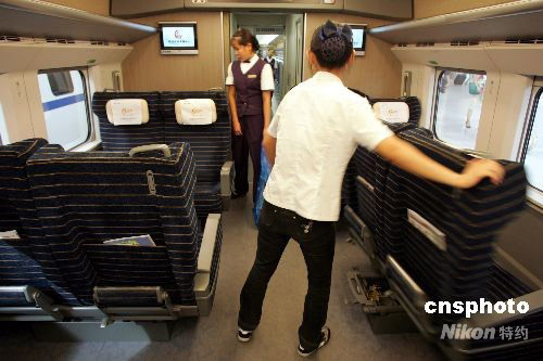 8月1日,城際高速鐵路列車員在列車到達(dá)北京南站時(shí),熟練的將車廂內(nèi)所有座椅180度轉(zhuǎn)向,以便隨后登車的北京旅客在旅途中一直面向列車前進(jìn)方向。