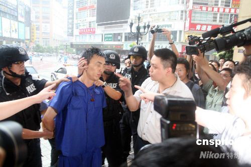 8月2日下午,重慶市解放碑商業(yè)區(qū)一百貨大樓遭爆炸恐嚇,警方接警后五小時(shí)內(nèi)成功將犯罪嫌疑人抓獲,并經(jīng)排查該大樓暫未發(fā)現(xiàn)可疑物品。圖為重慶警方將犯罪嫌疑人帶往該大樓,該商場(chǎng)保安對(duì)犯罪嫌疑人進(jìn)行指認(rèn)。中新社發(fā) 周陽 攝
