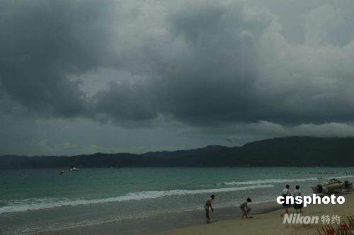 8月6日,受強熱帶風(fēng)暴“北冕”影響,海南三亞亞龍灣國家旅游度假區(qū)上空烏云密布,降雨不斷,沙灘上的游人相較往日有所減少。中新社發(fā) 尹海明 攝