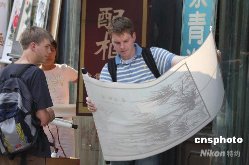 8月25日,兩位外國(guó)游客特意來(lái)到北京潘家園古玩市場(chǎng)購(gòu)買(mǎi)卷軸畫(huà)。雖然北京奧運(yùn)會(huì)已經(jīng)成功閉幕,但是開(kāi)幕式上富有中國(guó)特色的“卷軸畫(huà)”讓外國(guó)觀(guān)眾如癡如醉。如今,外國(guó)游客覺(jué)得能帶上一幅“卷軸畫(huà)”一起回國(guó)是件美事,潘家園的“卷軸畫(huà)”市場(chǎng)也開(kāi)始熱銷(xiāo)。中新社發(fā) 吳芒子 攝