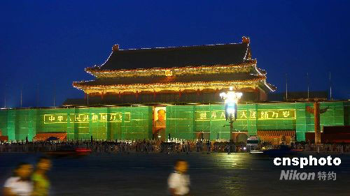 8月28日晚,粉刷中的北京天安門城樓在夜幕下別樣美麗。近日為迎接北京殘奧會和“十一”國慶節(jié)到來,天安門城樓開始加裝圍擋,進(jìn)行粉刷施工。據(jù)悉今年粉刷工作將在殘奧會前完工。中新社發(fā) 張愛東 攝