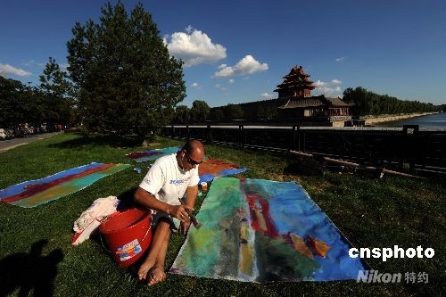 8月31日,北京天氣晴朗藍天中漂浮著朵朵白云,新加坡籍殘疾人Gregory Burns坐在故宮北門外的綠地上為藍天白云下的北京城作畫。中新社發(fā) 廖攀 攝
