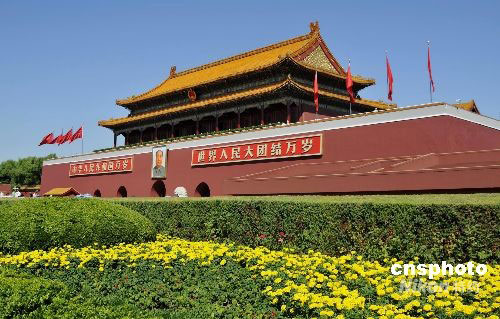 9月1日,北京奧運(yùn)會(huì)后,天安門城樓重新粉刷裝飾一新,在藍(lán)天鮮花的陪襯下,更顯雄偉壯觀,迎接殘奧會(huì)即將到來(lái)。中新社發(fā) 王宇婷 攝