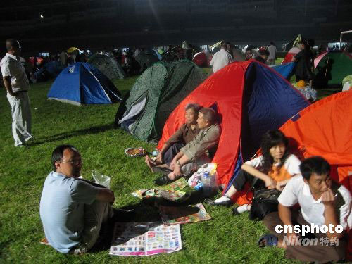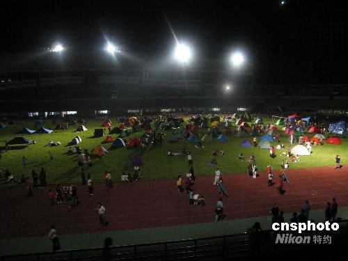 九月一日晚,上千名攀枝花市民在攀枝花體育場搭帳篷過夜。因害怕再次發(fā)生余震,許多市民從家里搬到了體育場內(nèi)。體育場已免費(fèi)向市民開放,并二十四小時(shí)提供熱水。中新社發(fā) 劉子倩 攝