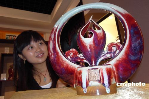 為慶祝第二十四個(gè)教師節(jié),表達(dá)對(duì)教師的感謝和敬意,河南禹州榮昌鈞瓷坊精心燒制出鈞瓷作品《師恩瓶》,作品由抽象的牛首和燃燒的蠟燭造型構(gòu)成,以孺子牛與蠟燭象征教師的奉獻(xiàn)精神和高尚情操。中新社發(fā) 牛書培 攝