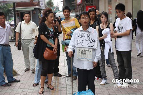 9月9日,一名特別的“乞丐”在哈爾濱市南崗區(qū)果戈里大街乞討。記者了解到,“乞丐”名叫夏海波,1982年9月15日出生,高二時(shí)因病輟學(xué),治病花光了家里的錢,但是病還是沒有醫(yī)治好。2006年他離開家鄉(xiāng),試圖找份工作養(yǎng)活自己,但因?yàn)樽陨須埣矝]有找到合適的工作。生活使他走上街頭,試圖靠乞討的錢治病延緩病情發(fā)展。夏海波開了博客,將每天的感受記錄在博客里。他在博客里公開了自己的銀行帳號,以便接受網(wǎng)友的捐助。中新社發(fā) 王忠言 攝