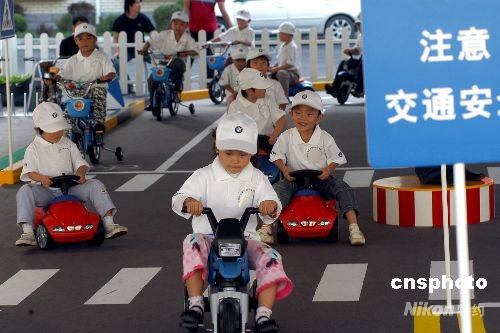 9月11日,為期三天的2008BMW兒童交通安全訓(xùn)練營(yíng)沈陽站在和平區(qū)少年宮開營(yíng)。在BMW兒童交通安全主題公園里,十字路口、交通崗、紅綠燈、斑馬線、雙黃線、警示牌等一應(yīng)俱全。來自沈陽多所幼兒園的80名孩子駕駛著玩具寶馬汽車、摩托車和自行車行駛在這一個(gè)“縮小版”的繁華街道上。中新社發(fā) 文契 攝