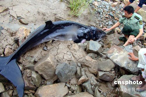 9月13日上午,一條鯨魚受強臺風“森拉克”影響而迷失了航向,擱淺在浙江溫州市靈昆島的灘涂上。發(fā)現(xiàn)受傷鯨魚后,靈昆邊防派出所官兵迅速展開營救,和當?shù)厝罕娨黄饘R淺鯨魚送歸大海。據(jù)悉,該鯨魚長約2.5米,重約700余斤,尾部被巖石刮傷,屬于須鯨類。中新社發(fā) 吳水斌 攝