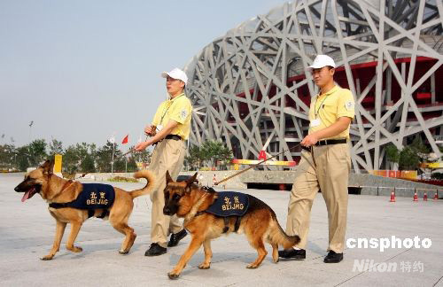 2008年9月17日,北京殘奧會(huì)閉幕式即將開(kāi)始,警方工作人員牽著多條防爆犬對(duì)“鳥(niǎo)巢”進(jìn)行地毯式檢查,保障殘奧會(huì)順利閉幕。中新社發(fā) 吳芒子 攝