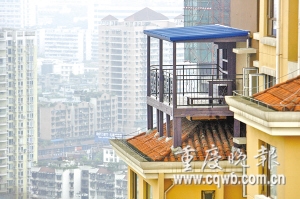 32樓的高空竟搭建起一個(gè)近20平米的陽臺(如圖)。除了驚嘆,網(wǎng)友們戲稱之為“重慶最牛陽臺”、“重慶第九奇跡建筑”。